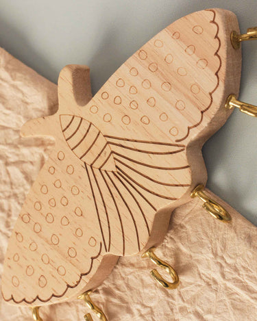 Hand-painted and carved wooden butterfly hanger. It has a flat base for wall mounting, adding a vintage touch. The back features the inscription "Apodemia," reminiscent of a sculpture.